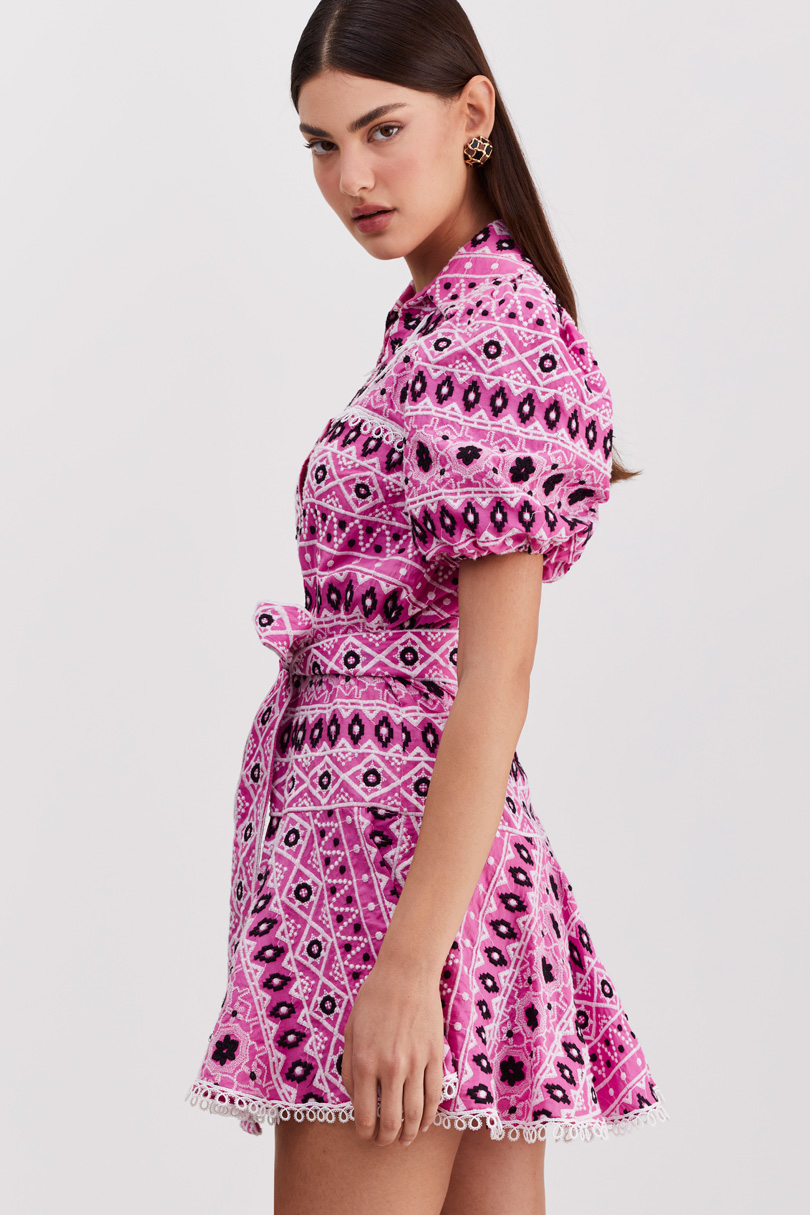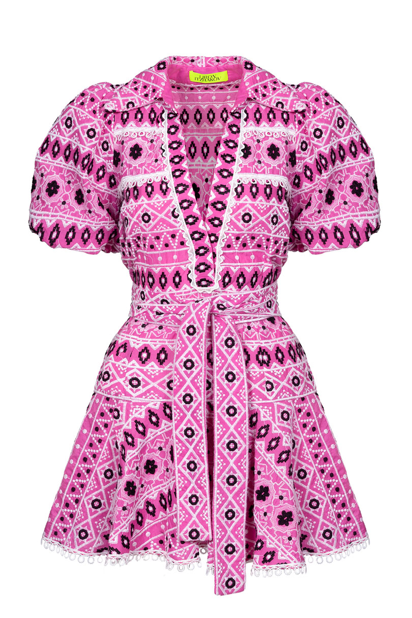 The Simona Dress is the brand best seller! Designed with our iconic embroidery and timeless silhouette. This dress features a puff sleeves and a V neck with lace details and comes with a matching belt. This is our MUST HAVE dress. Style it with a woven bag to complete the look.