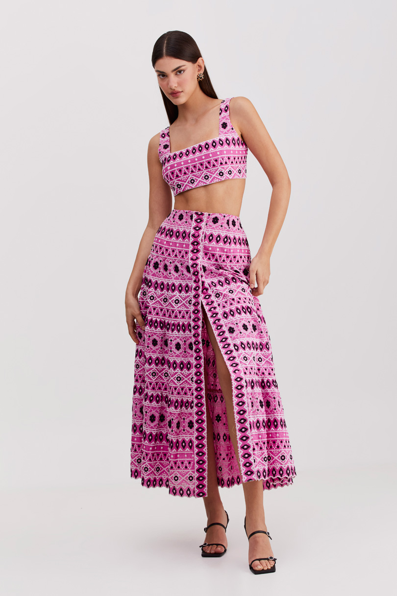 The Sofia maxi skirt designed with a feminine, sexy silhouette. The skirt features a button up opening and adjustable fit. Style it with our Sofia top.